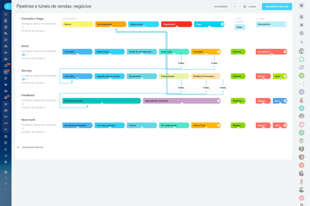 É possível, por exemplo, configurar ações automáticas como envio de e-mails, criação de tarefas ou movimentação de negócios com base em condições específicas.