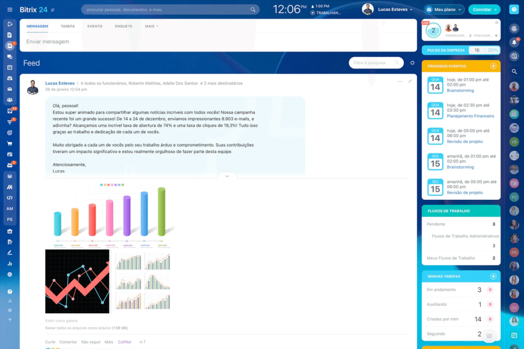 Inspirado em redes sociais, o Bitrix24 conta com um feed interno onde os colaboradores podem compartilhar atualizações, comemorar resultados e comentar publicações.