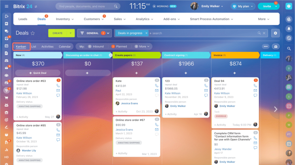 O CRM do Bitrix24 é um dos mais robustos e personalizáveis do mercado. Ele oferece automação de funis de vendas, gestão de leads e oportunidades, integração com WhatsApp, Facebook, Instagram e e-mail, além de recursos de pagamentos online, orçamentos e assinatura eletrônica.